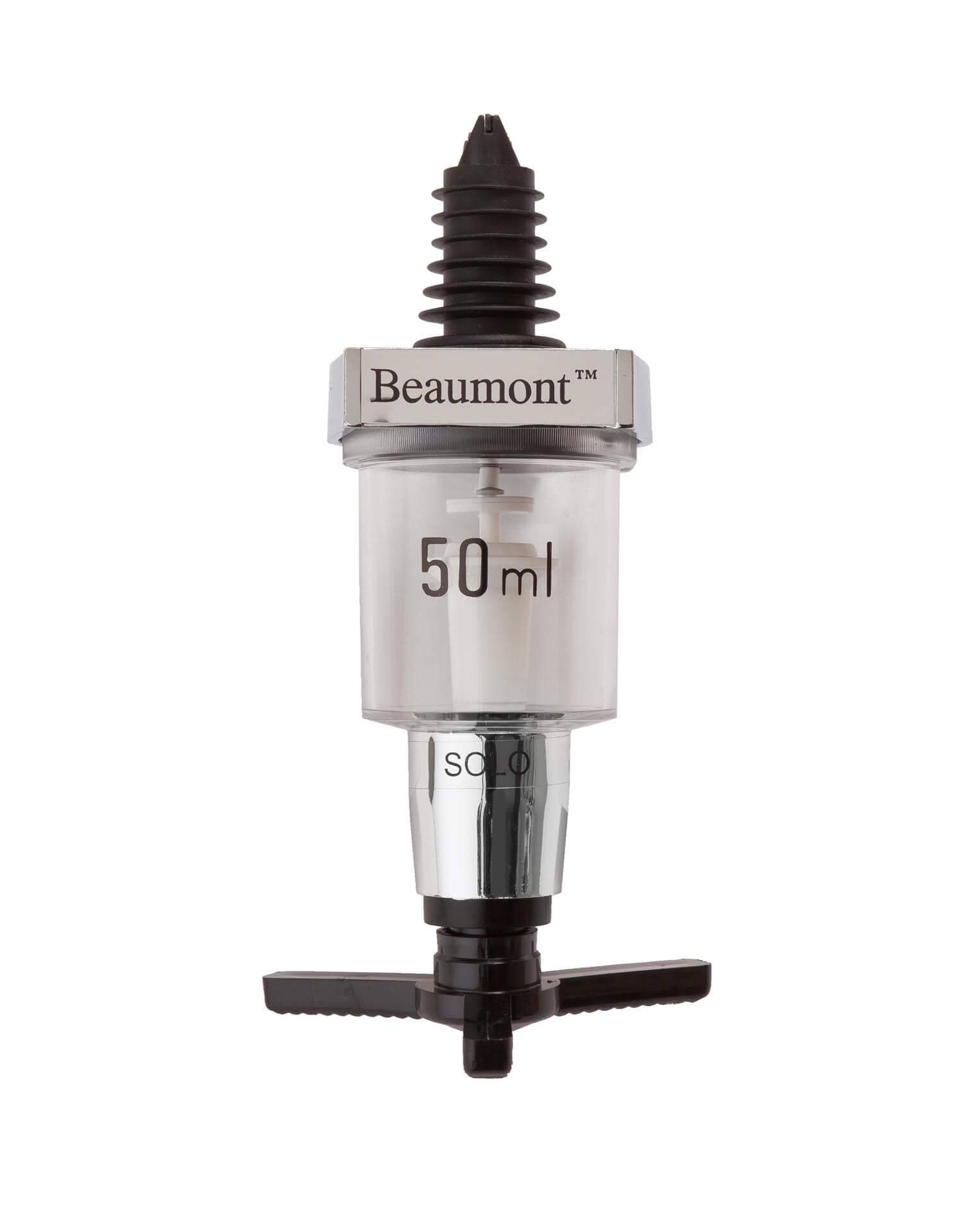 This is the 50ml Solo Classical Chrome spirit measure. An industry-leading Beaumont spirit measure (optic) featuring a renowned non-drip mechanism. Each measure is government stamped to precisely 50ml and manufactured in the UK. Finished in chrome for a stylish and professional aesthetic, with dimensions of 160(H) x 82(W) x 88(D)mm, constructed from stainless steel and plastic, and weighing 158g. Designed for single-handed operation.