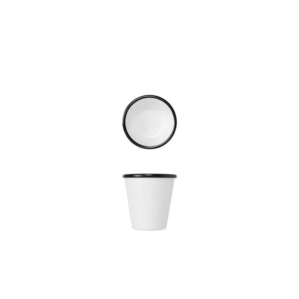 This pack contains 24 Black/ White Melamine Athens Pots (9.2 x 9cm), presenting a contemporary reimagining of retro enamelware. The striking monochrome colour scheme, complete with a characteristic bevelled rim, delivers a versatile and fashionable solution for displaying food in diverse environments. These pots offer a modern and practical update on a vintage classic.