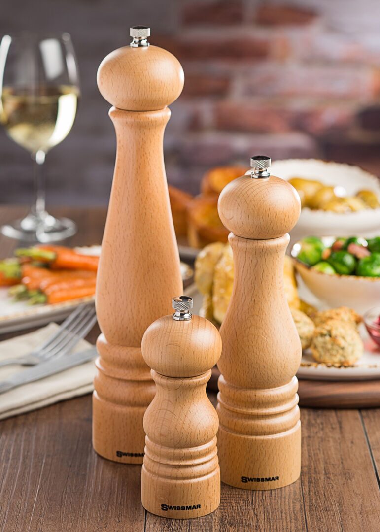 * Enhance your table setting with the natural aesthetic of these elegant wooden mills.