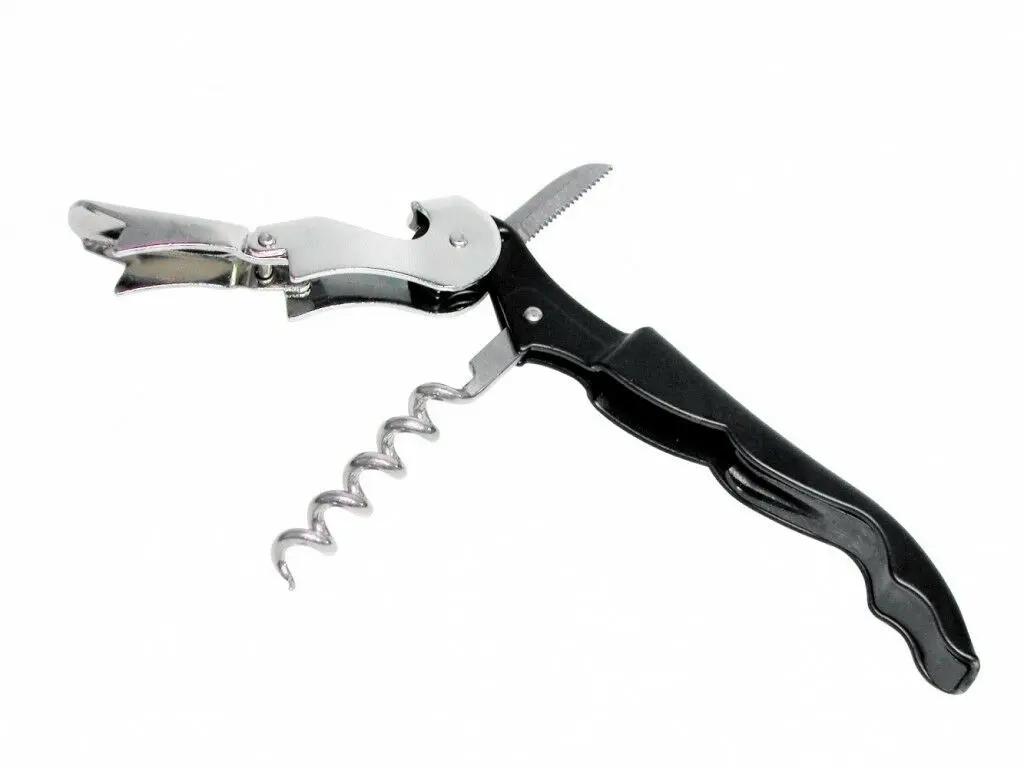 The Double Reach Corkscrew / Waiters Friend / Bottle Opener is a compact, multi-purpose tool designed for efficient use in bars, restaurants, and clubs. It includes a serrated blade, corkscrew, and bottle opener for versatile service.
