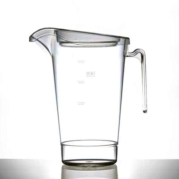 This listing provides a case of 4 Elite In2stax 4 Pint Jugs CE With Lids. Each jug is CE marked and clearly lined at 4, 3, and 2 pint levels, guaranteeing precise measurements. Manufactured in the UK from virtually unbreakable polycarbonate, these jugs are designed to withstand the rigours of daily use and are glass washer safe for up to 1000 cycles. The clear jug has a top width of 188mm, a bottom width of 109mm, and a height of 266mm, weighs 480g and has a total capacity of 2272ml (80oz). The Elite In2stax 4 Pint Jug is the reliable solution for your busy environment. Optimised for Elite In2stax 4 Pint Jug CE With Lid – Case of 4.
