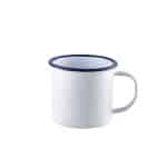 That’s why we offer the **Enamel Mug White with Blue Rim 36cl/ 12.5oz**. More than just a vessel for beverages, these mugs make a statement. Featuring a classic white enamel finish accented with a blue rim, these mugs bring a touch of retro style to any occasion, be it camping, a cafe setting, or simply enjoying a comforting drink at home. The vitreous, double-coated enamel offers resistance against stains and scratches, enhancing the product’s longevity and guaranteeing a lasting impression. Designed to withstand temperatures ranging from -10 to 270C, these mugs are as versatile as they are stylish.