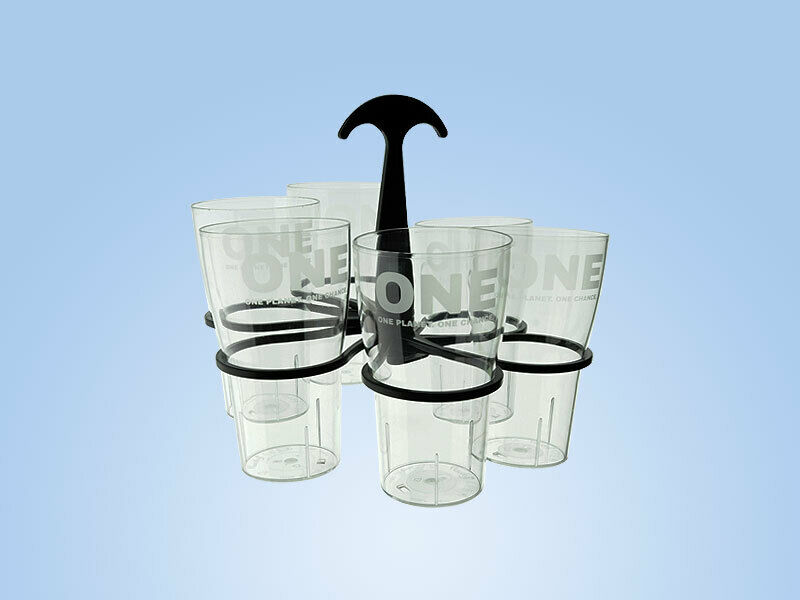 Our Fold Away Cup Carrier / Glass Holder – Holds up to 6 cups at once! is made from heavy-duty, food-grade polypropylene plastic. This organic plastic is recyclable, durable, and designed for years of re-use. The carrier folds easily to pocket size and opens simply, ready to carry up to six cups, pints, or bottles securely. Perfect for outdoor pubs, bars, gardens, festivals, and events, it encourages upselling and increases revenue by making it easier for customers to carry multiple drinks.