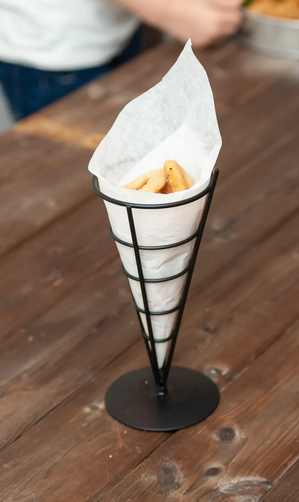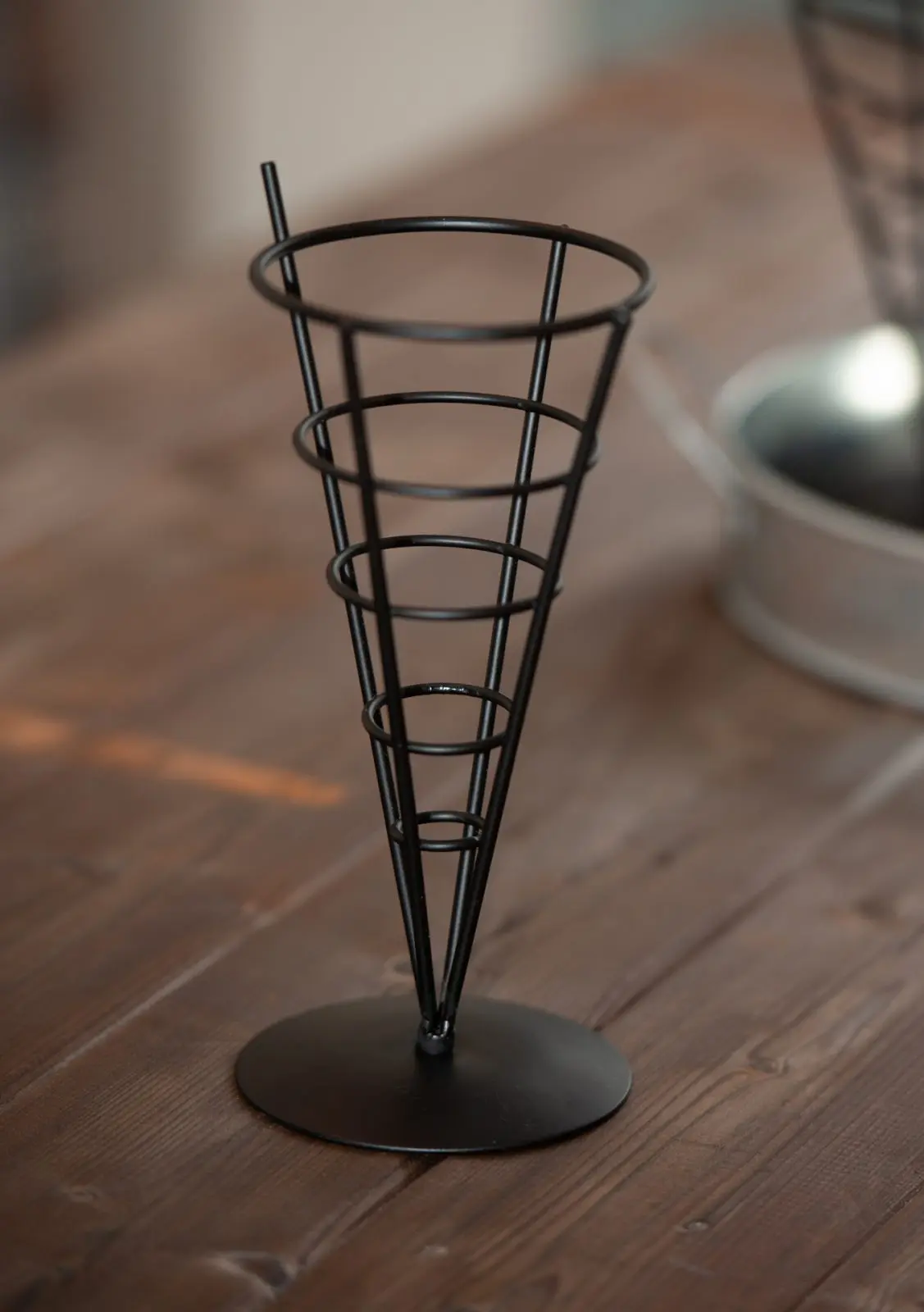 Introducing the Beaumont French Fry Cone Black Wire – a charming and practical serving solution designed to hold generous portions of sides, freeing up valuable plate space for main courses. The black wire finish offers a rustic yet sophisticated aesthetic, perfect for enhancing the presentation of classic dishes like chips, fries, onion rings and more. Crafted for frequent use, this cone is a durable addition to any pub, restaurant, or catering establishment.