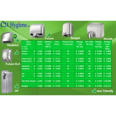 * Delivers a cost-effective hand drying solution with an average annual running cost of under £7, providing a rapid return on investment.