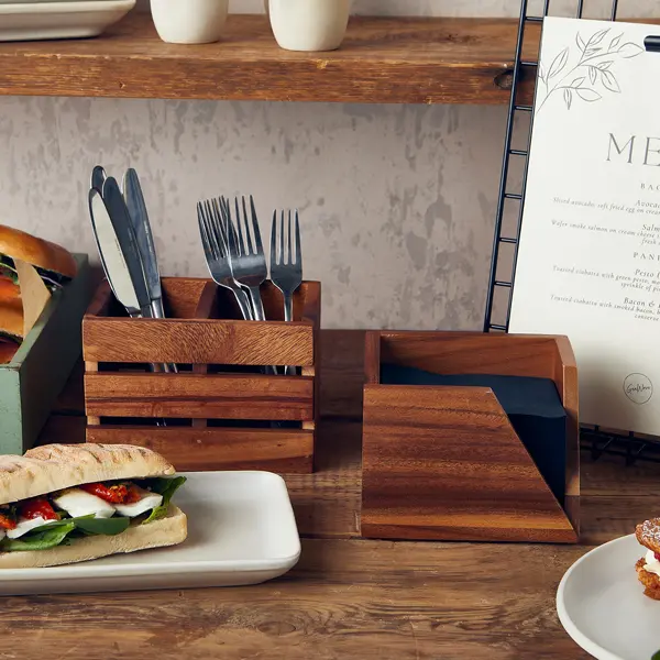 Crafted from beautiful acacia wood, this holder exudes a natural and contemporary feel. Its two compartments allow for efficient separation and organisation of knives, forks, and spoons, or even condiments. The natural wood finish adds warmth and texture, subtly enhancing the overall dining experience for your customers. This isn’t just about holding cutlery; it’s about elevating your brand.