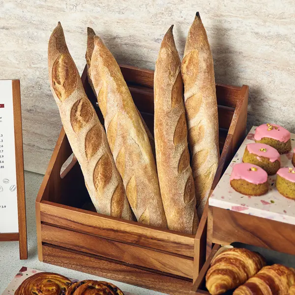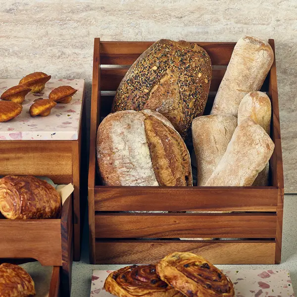 Introducing the GenWare Acacia Wood Angled Crate GN 1/2 – a sophisticated display solution crafted from sustainably sourced acacia wood. Its angled design provides an eye-catching showcase for breads, pastries, fruits, and other delectable items. The Gastronorm (GN) 1/2 size ensures compatibility with standard catering setups, while integrated handles provide ease of handling and transportation.