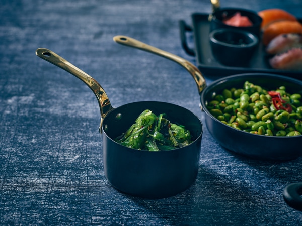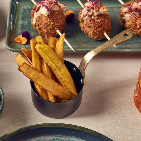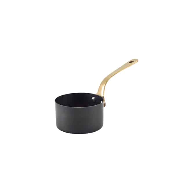 Introducing the GenWare Black Vintage Steel Mini Sauce Pan (7.8 x 4.5cm) – available in a pack of 6. These mini sauce pans, part of the distinctive Black Vintage Steel collection, bring an industrial-chic aesthetic to your table. Crafted from stainless steel with a durable black PVD coating, they are safe for direct food contact and feature an eye-catching brass handle. Ideal for presenting premium sauces, sides, starters, or desserts in upscale casual dining settings, they pair beautifully with white or reactive glazed ceramic serveware.