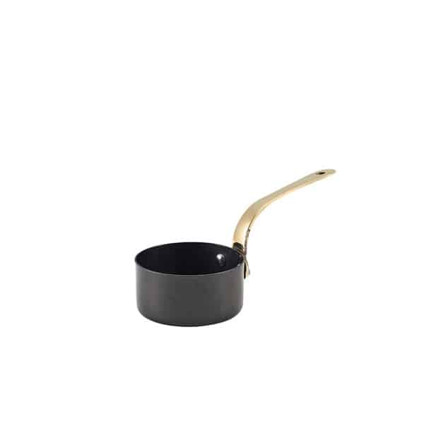 What we offer is the **GenWare Black Vintage Steel Mini Sauce Pan 7 x 3.75cm – Pack of 6**. These mini sauce pans are crafted from stainless steel with a vintage industrial finish and a resilient black PVD coating, making them safe for direct food contact. Each pan features an eye-catching brass handle, adding a touch of sophistication that’s ideal for upscale casual dining. Perfectly sized for presenting premium sides, starters, desserts, condiments or sauces, they complement white or reactive glazed ceramic tableware beautifully.