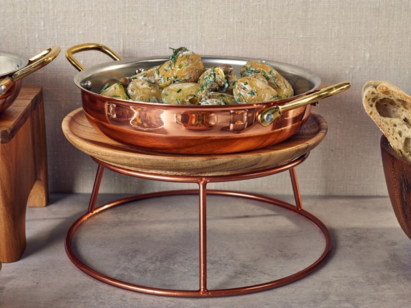 These risers instantly add height and dimension to any buffet setup, making your dishes more visible and accessible. The attractive copper finish lends a touch of elegance and sophistication. The non-slip coating ensures your platters and bowls stay safely in place, preventing accidents and maintaining a polished appearance.