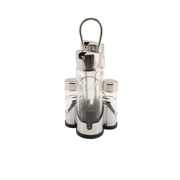 Introducing the Genware Oil, Vinegar & Cruet Set with Stand. This set provides a sleek and organised way to present essential condiments. Perfect for pubs, restaurants, and any dining environment, its durable glass construction guarantees long-lasting performance and a touch of sophistication.