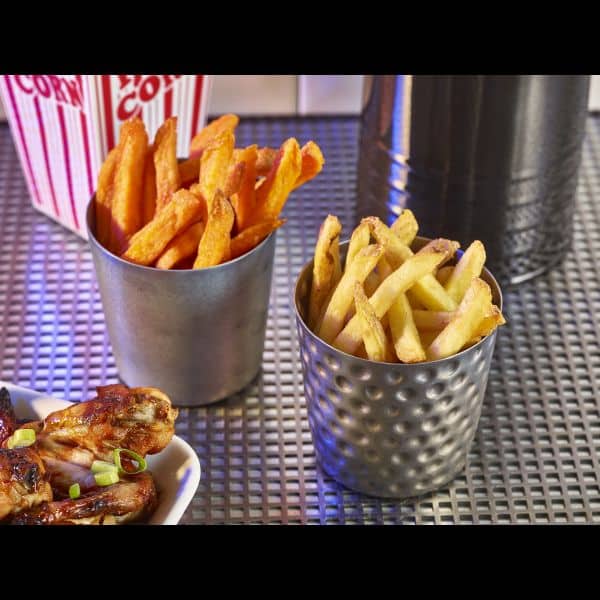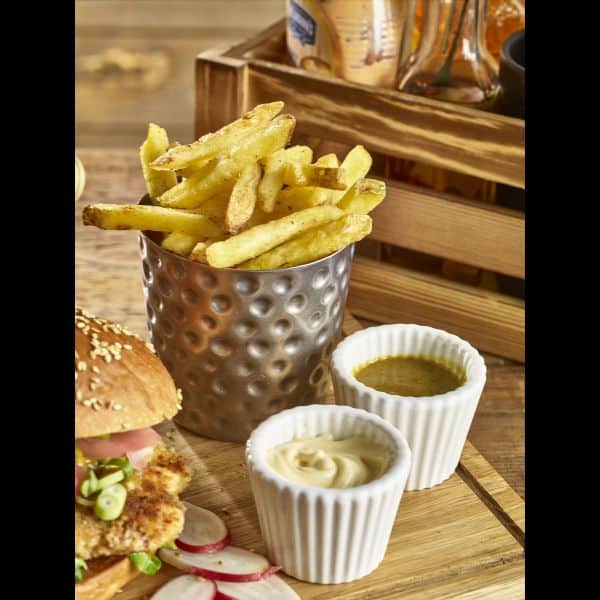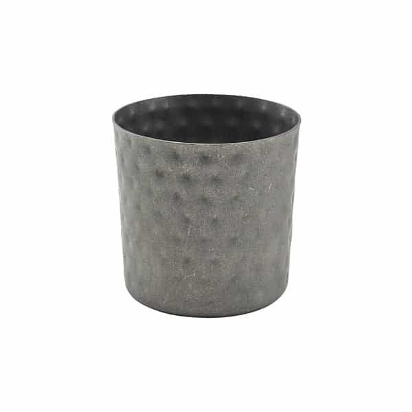 Introducing the GenWare Vintage Steel Hammered Serving Cup, measuring 8.5 x 8.5cm. This pack of 12 cups is perfect for presenting side dishes, fries, or even desserts with a rustic, industrial flair. The hammered steel finish adds a touch of vintage charm, elevating your food presentation beyond the ordinary, especially well-suited to complement steaks, burgers and chips.