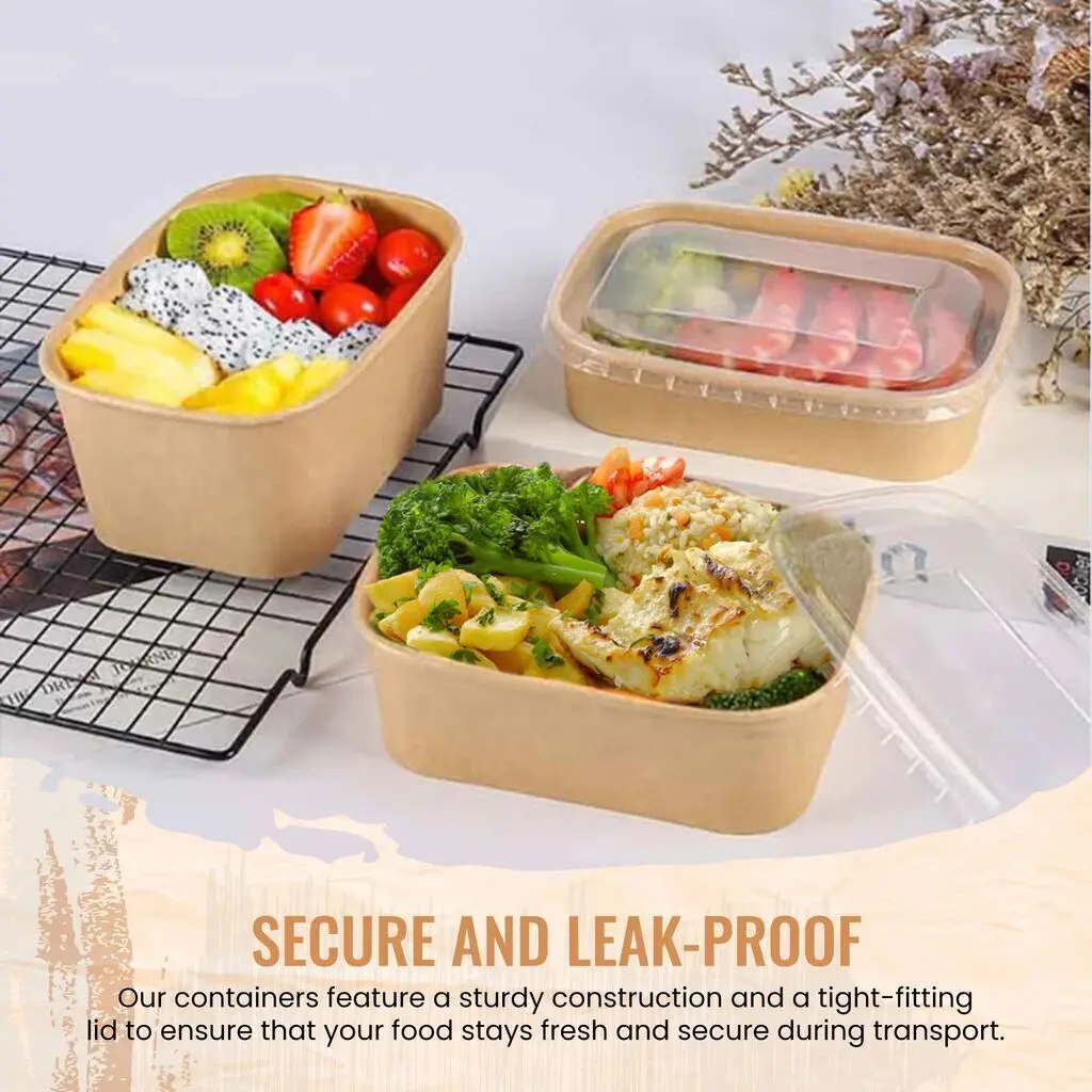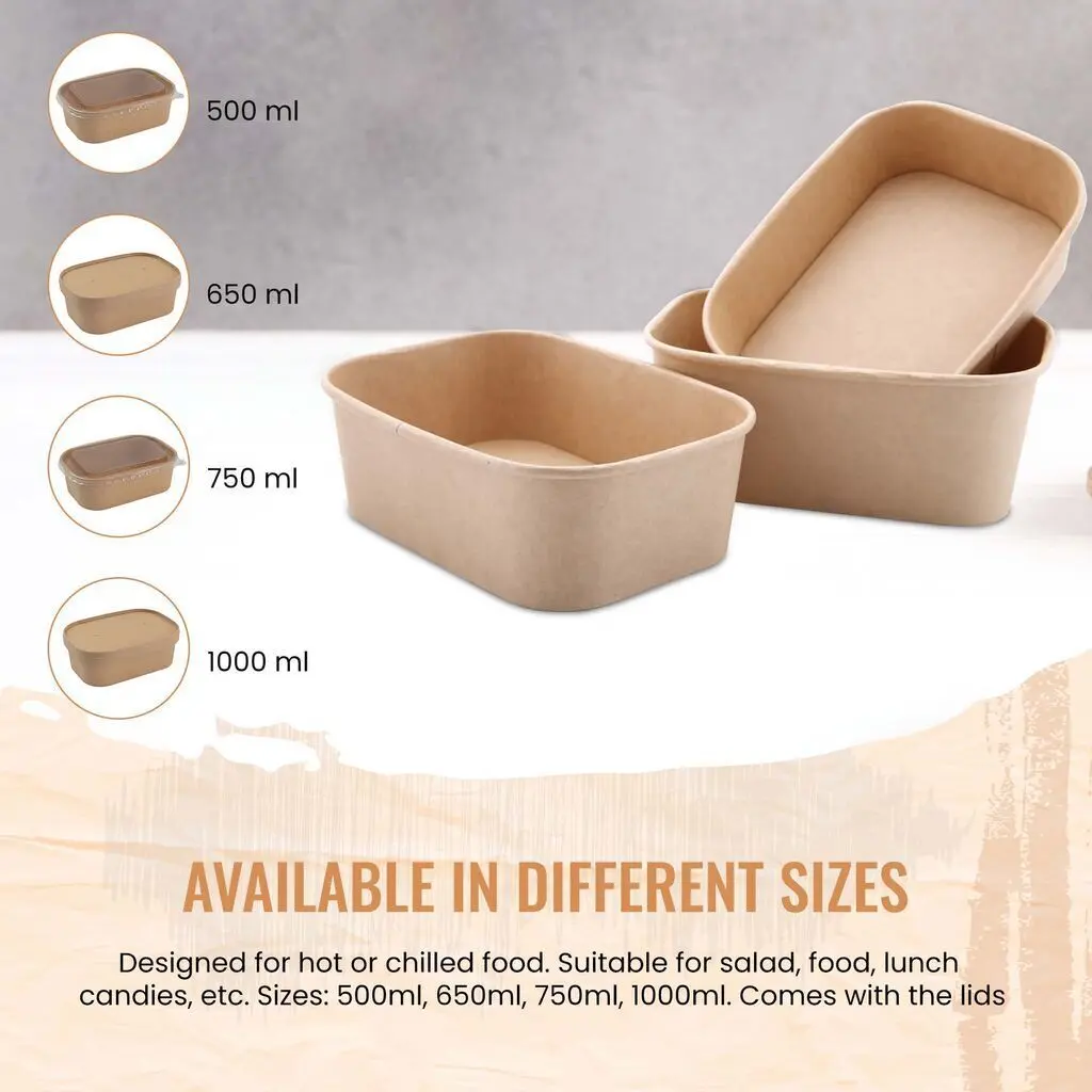 The containers are manufactured from durable kraft paperboard, designed to provide strength and reliability for takeaway, food storage, and meal preparation.