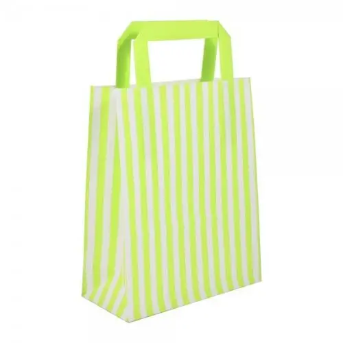 Introducing our **Large Green Striped Flat Handled Paper Bags**. Proudly manufactured in the UK using robust 70gsm pure virgin paper, these bags seamlessly combine practicality with eye-catching design. The square base allows the bag to stand freely, offering convenience for both you and your customers. Ideal for cafes, catering companies, boutiques, corporate events, and even children’s parties, these bags offer a versatile and environmentally conscious alternative to plastic.