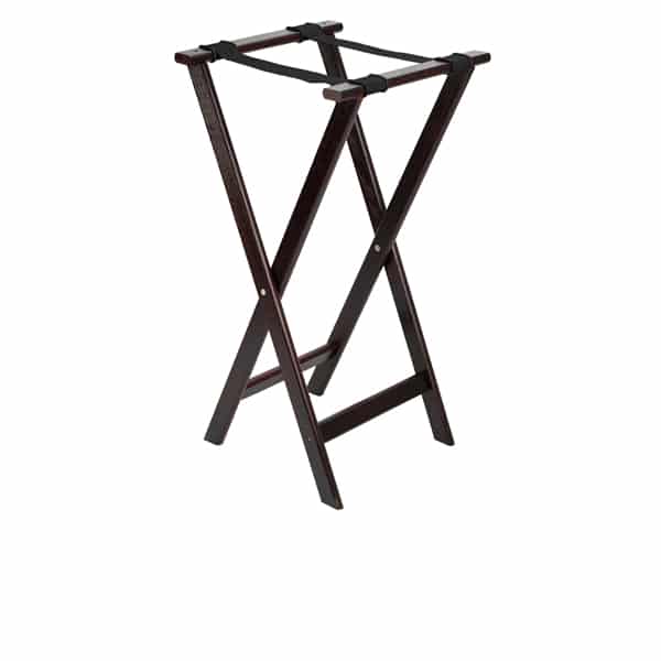 We offer the Mahogany Tray Stand 33″/ 840mm High 16.5″/ 420mm Wide. Constructed from sturdy birch wood and finished with a deep mahogany stain, these foldable tray stands provide a stable and attractive base for serving trays loaded with food and drinks. Ideal for busy restaurants, hotels, and catered events, they offer a natural and sophisticated alternative to conventional stainless-steel options. Please note that trays need to be at least 42cm/16″ wide to ensure stability.