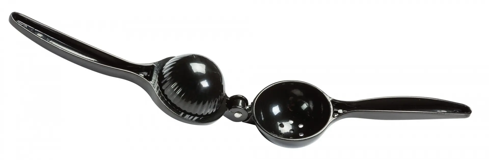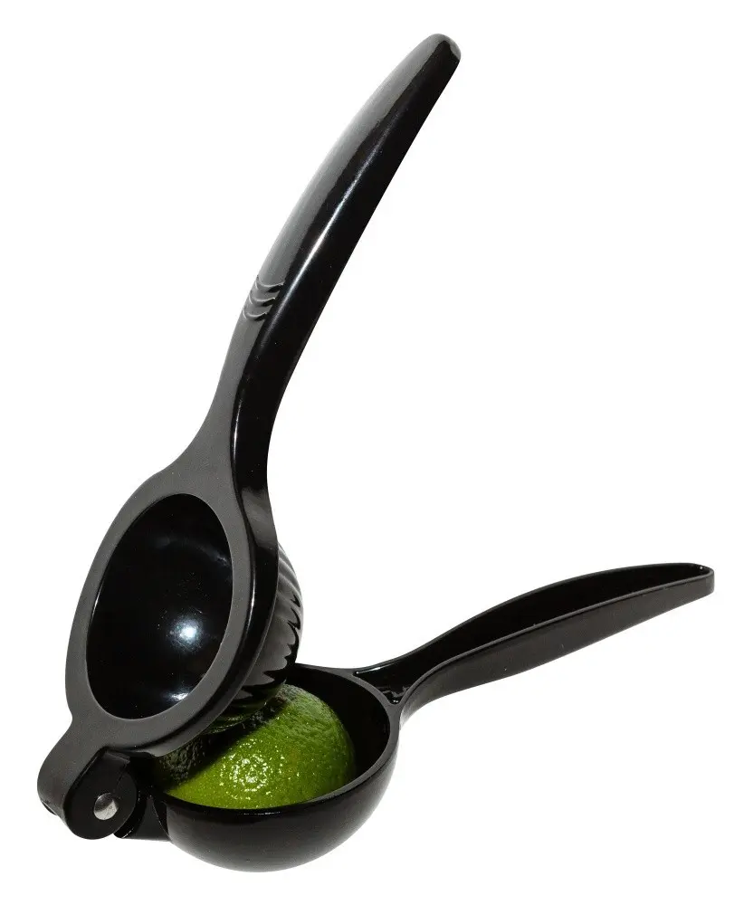 Mexican Elbow Lemon & Lime Squeezer is a black plastic tool with a cast aluminum core, designed for efficient juicing. Its ergonomic construction makes it ideal for busy bars, ensuring quick, fresh juice production.