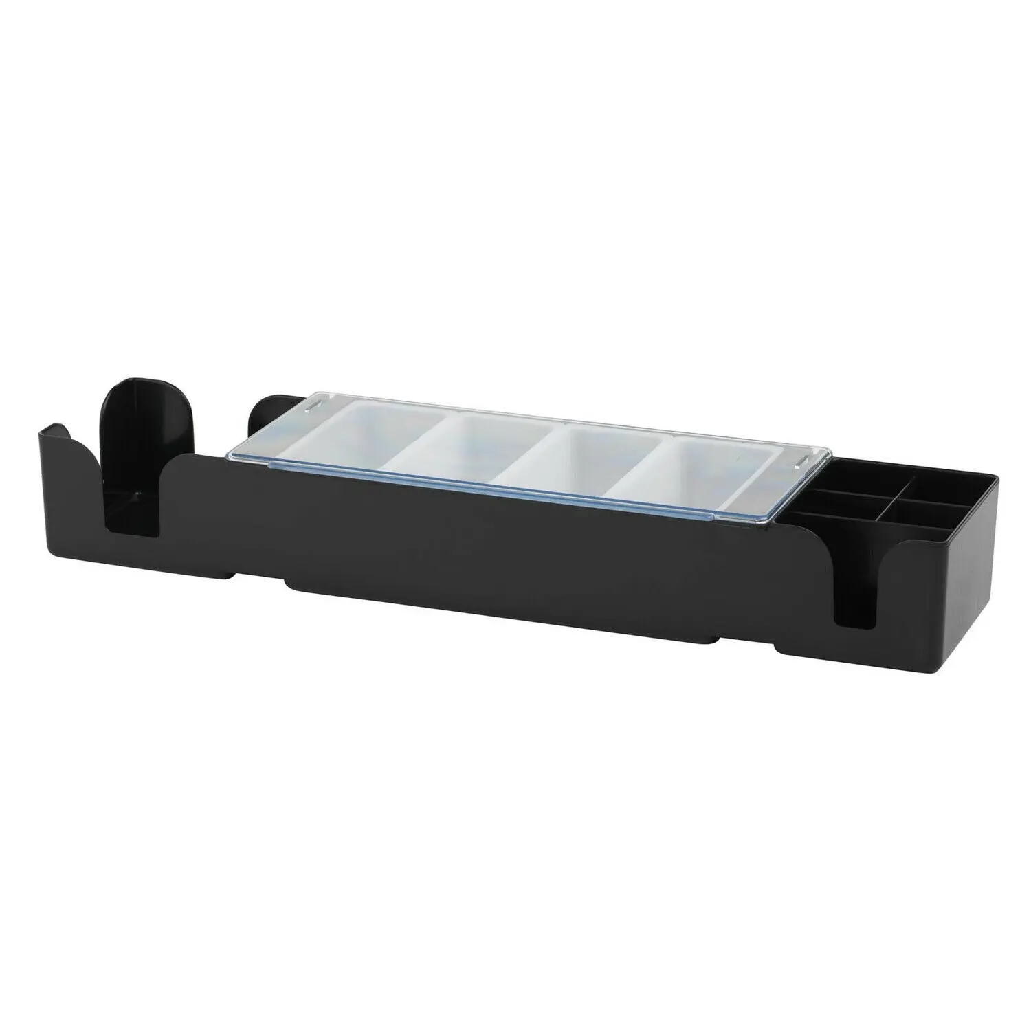 This dispenser, expertly crafted from robust, durable black plastic, features an ingenious design with dedicated compartments for all essential bar necessities. A larger section is perfectly sized for napkins, while four smaller compartments are ideally suited for a range of condiments. The clever hollow base allows for direct placement onto ice, ensuring your garnishes remain attractively chilled, even throughout peak service periods. Measuring 60.5cm (L) x 15.4cm (W) x 9.3cm (H) and with a lightweight design of just 1.039kg, it offers ample storage without being cumbersome or difficult to move.