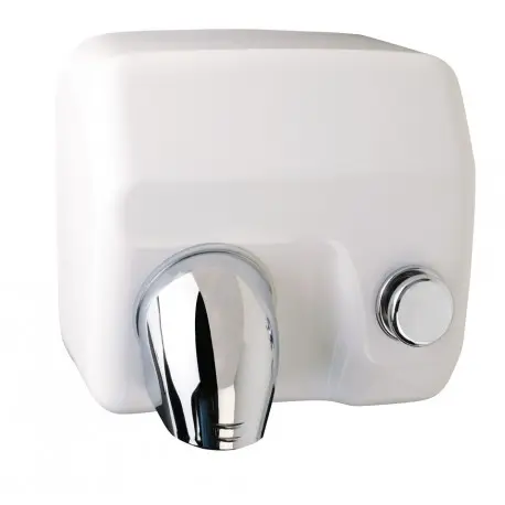 Introducing the Push Button Nozzle Hand Dryer in white. This hard-wearing hand dryer delivers a forceful stream of air activated with a simple button press. Its 360-degree rotating nozzle provides complete and pleasant hand drying. Perfect for busy bars, restaurants and other commercial environments where noise reduction and efficiency are paramount. Constructed from robust materials, it offers resistance against vandalism and promises lasting performance. Dimensions: Height: 240mm, Width: 270mm, Depth: 200mm. Operating Voltage & Power: 220-240 Vac, 50/60 Hz, 2.3KW. Benefit from a one-year warranty as standard, with extended warranty options also available.