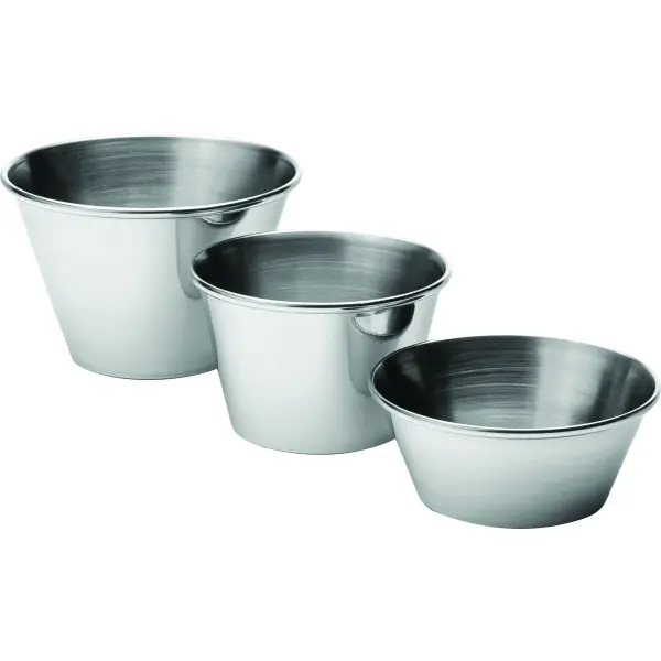 This pack contains 24 stainless steel ramekins, each with a 4oz (11cl) capacity. Measuring 72mm in diameter and 47mm in height, these ramekins are perfectly sized for individual servings of sauces, dips, condiments, desserts, and other culinary delights. Crafted from robust stainless steel, they are designed for repeated use and easy cleaning, making them an indispensable addition to any professional or home kitchen.