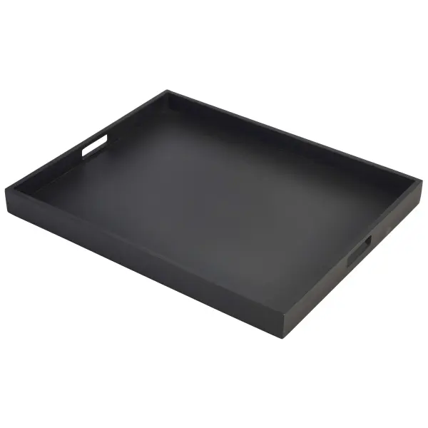 Introducing the Solid Black Butlers Tray 53.5 x 42.5 x 4.5cm: a stylish and functional serving solution crafted from durable acacia wood. Its sleek, modern black design complements any setting, making it ideal for restaurants, hotels, events, or even elevated home use. This lightweight yet strong tray provides ample space for transporting drinks, snacks, or tableware with ease, adding a touch of understated elegance to any occasion. For optimal care, simply wash by hand.