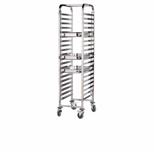 The St/St. Gastronorm 1/1 Trolley features 20 shelves perfectly spaced to accommodate 1/1 gastronorm containers of varying depths. It is constructed from high-quality stainless steel, ensuring longevity and ease of cleaning. With heavy-duty castors, including two with brakes, this trolley offers exceptional manoeuvrability and stability. It comes flat packed for economical shipping and straightforward assembly. Now includes additional strengthening bar half way up trolley.