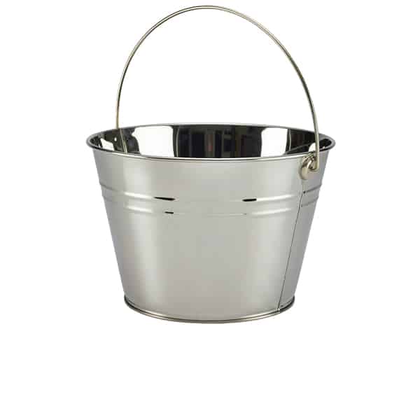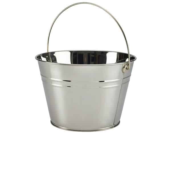Introducing the **Stainless Steel Serving Bucket 25cm Dia**. This bucket adds a touch of rustic sophistication to any table setting, evoking the charm of a traditional gastro pub. Ideal for presenting sharing platters, it can be used on its own or lined with greaseproof paper for effortless cleaning and an enhanced aesthetic appeal. Transform your serving style with this versatile and stylish piece.