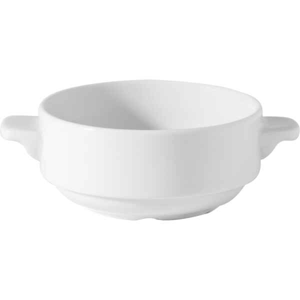 The Titan Lugged Soup Bowl is expertly crafted from fully vitrified porcelain, guaranteeing outstanding strength and longevity to withstand daily use. The timeless design provides versatility for a wide range of dining occasions, while the integrated handles ensure secure handling for staff and guests alike. Each bowl boasts a 10oz (28cl) capacity, perfectly sized for serving generous portions of soup or delectable starters. This pack contains six individual bowls, offering excellent value and convenience.