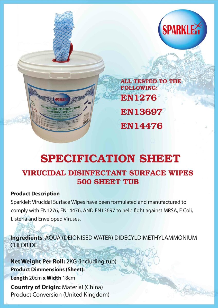 Tub of 500 Virucidal Disinfectant Surface Wipes