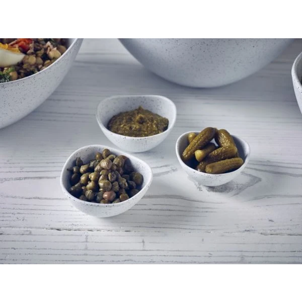 Because every detail contributes to a memorable dining experience, even the humble ramekin plays a part in enhancing your restaurant’s reputation. Provide your patrons with an elevated sense of quality and attention to detail, reflecting positively on your brand. We Can Source It simplifies the process of procuring durable and stylish servingware. We meticulously select suppliers who share our commitment to quality and value, ensuring you receive products that meet the demands of a busy hospitality environment without exceeding your budget. What we offer is a pack of 24 White Granite Melamine Triangular Ramekins, each with a 2.5oz capacity. Their modern triangular design, coupled with the sophisticated white granite finish, brings a contemporary touch to any table setting. Crafted from high-quality melamine, these ramekins are exceptionally resistant to chipping, scratching, and staining, maintaining their pristine appearance even with daily use. Suitable for temperatures between -20 and 70 degrees Celsius.