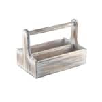 This White Wooden Table Caddy is ideal for organising sauces, condiments, and cutlery on tables. It features a modern, rustic white wash finish that complements a variety of table settings. The caddy includes two compartments for efficient organisation and a natural acacia wood handle for easy carrying.