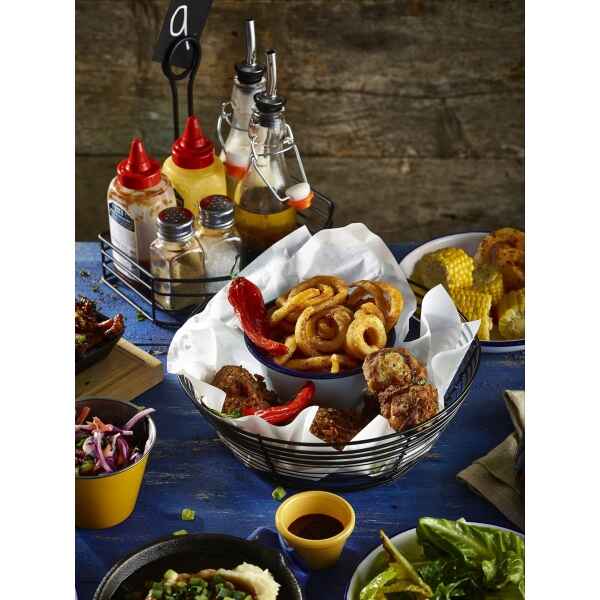 Therefore, we offer this: Wire Basket Round 25.5 x 8cm – Pack of 6. These baskets are ideal for showcasing everything from crusty baguette slices at a breakfast buffet to golden chicken wings, crispy onion rings, or perfectly cooked chips. Their unique design makes them a superb alternative for serving sharing platters or individual main courses, adding a touch of rustic charm to any table setting. They can also be incorporated into buffet or counter displays to enhance visual appeal.